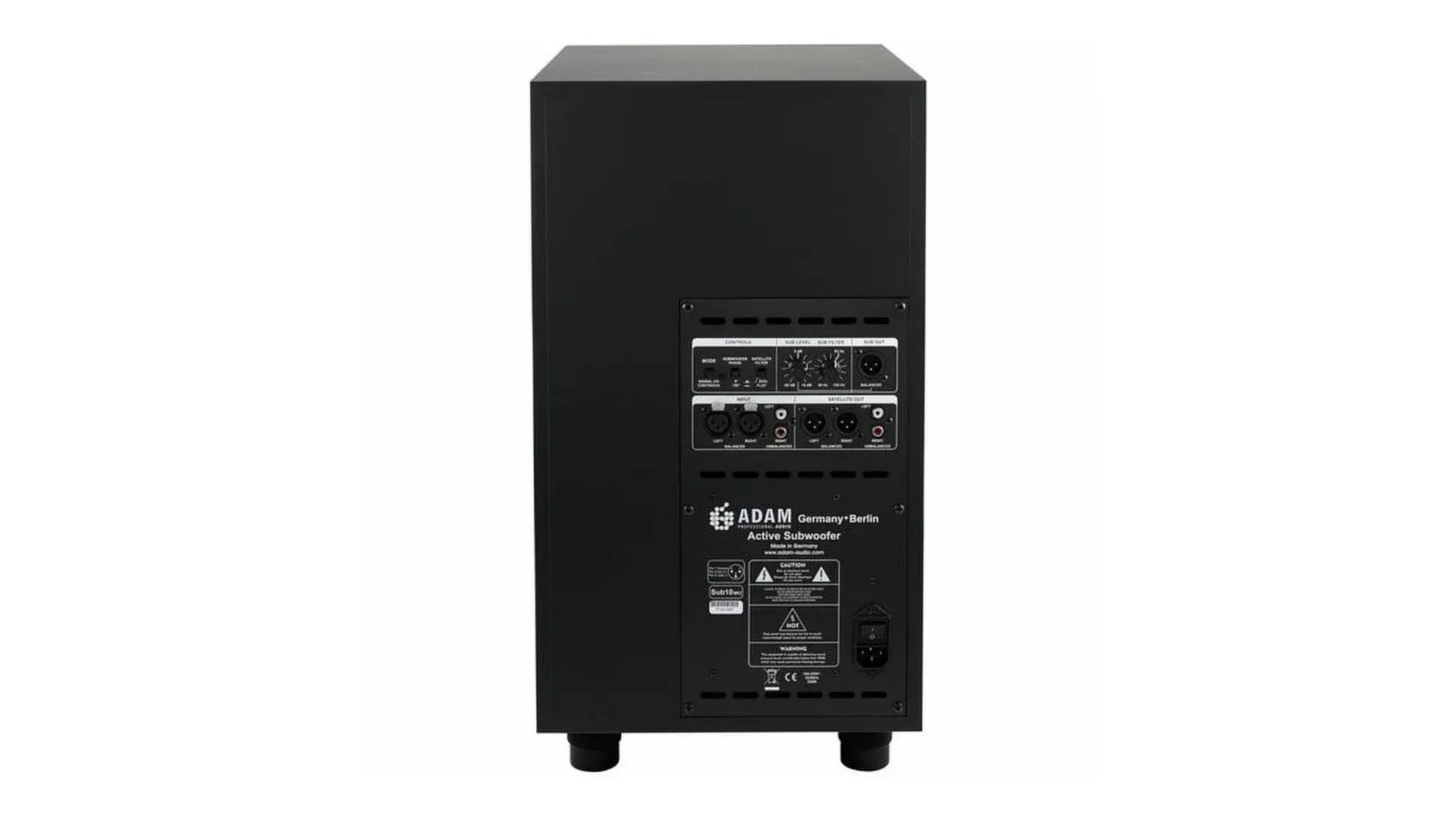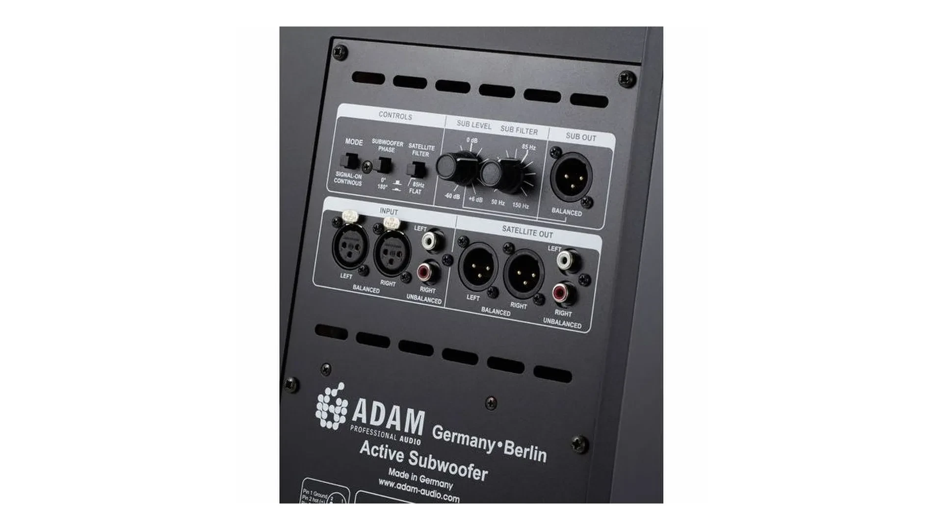 箱體使用了座地反射設計,可以減少不必要的通氣噪聲。在更大的房間或者需要更高聲壓級的情况下,用戶可以串聯多個ADAM低頻喇叭。所有輸入輸出都有XLR、RCA兩種不同接口。