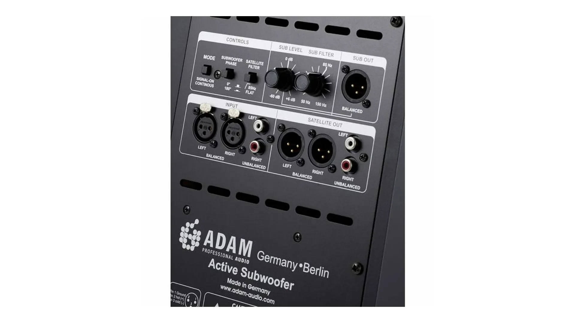 箱體使用了座地反射設計,可以減少不必要的通氣噪聲。在更大的房間或者需要更高聲壓級的情况下,用戶可以串聯多個ADAM Audio低頻喇叭。所有輸入輸出都有XLR以及RCA兩種不同接口。
