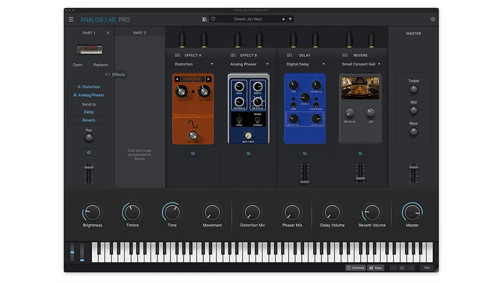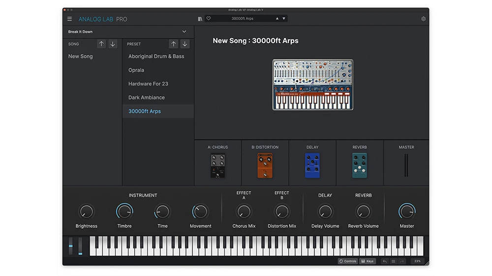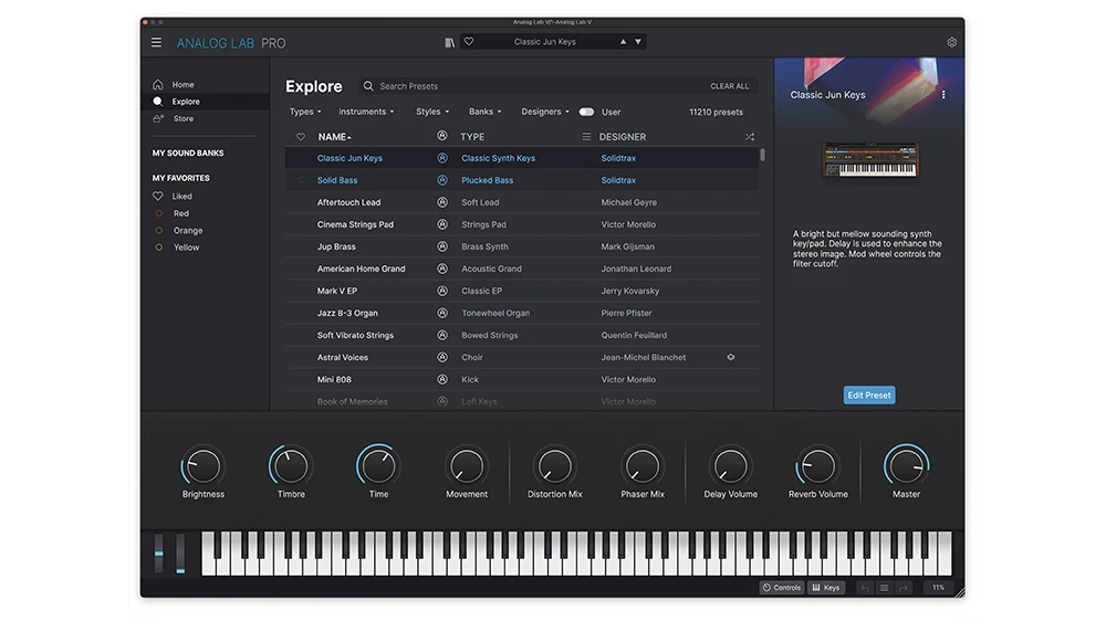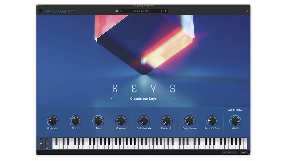 在 Analog Lab 中內含最新的現代樂器和多樣的復古音色,介面設計非常清晰明瞭,讓你在幾秒鐘內就能找到適合你風格的完美聲音,一切設定都在同一個軟體裡,輕鬆瀏覽、個人化、保存音色並演奏再也不用手忙腳亂。