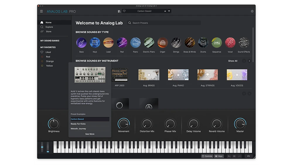 屢獲殊榮的 V Collection、Pigments 等軟體,所內含的鋼琴、風琴、類比和數位合成器的聲音在 Analog Lab 裡都找得到。