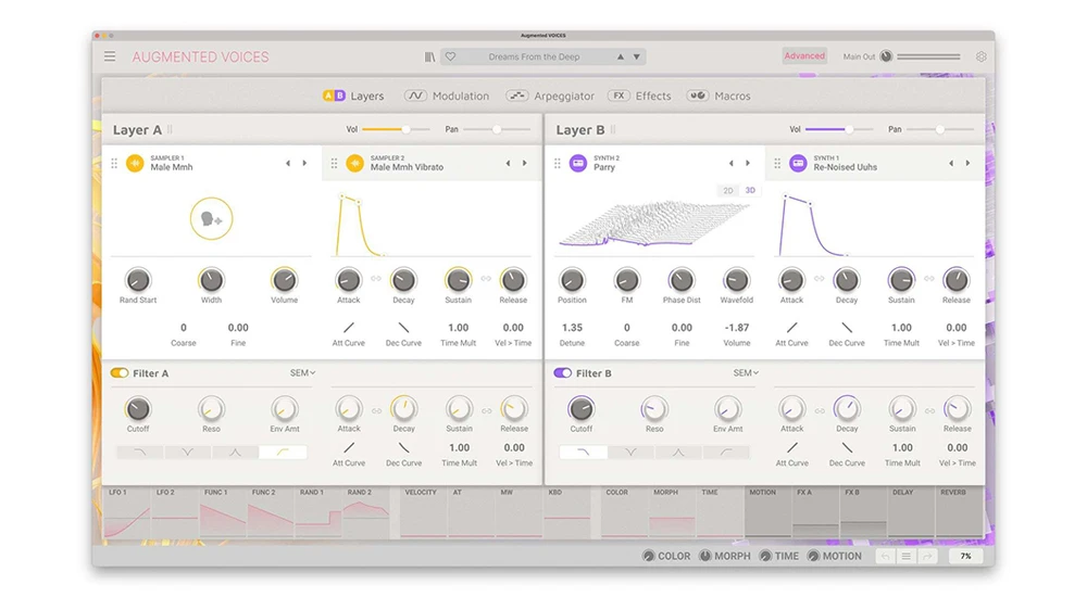 使用 Augmented VOICES 的多引擎架構創建您想要的任何類型的合唱或人聲。您有 2 個層可以玩,每個層包含 2 個聲源,允許您構建完全個性化的採樣和合成語音組合。