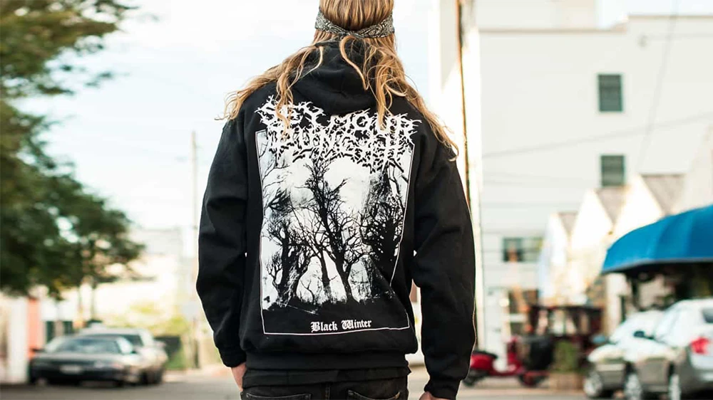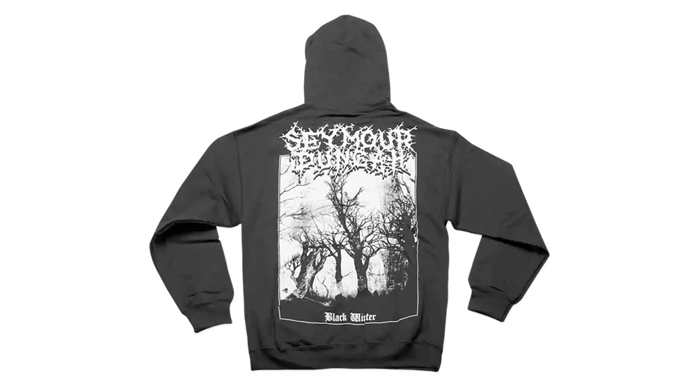 這款黑色帽T重量感強,前面有口袋,後背印上 Seymour Duncan 的黑色冬季鬼林圖案。