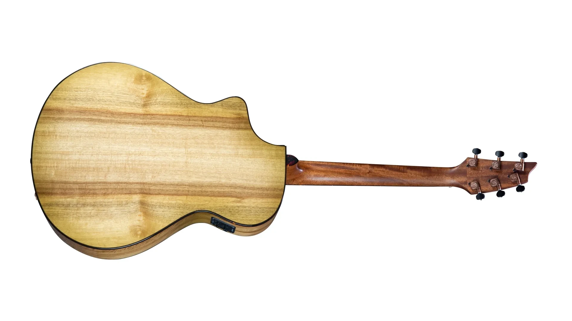 這把琴採用代表Breedlove拿手之作的香桃木(Myrtlewood),這種木頭結合了玫瑰木、桃花心木和楓木的最佳元素 —「豐富的低音、溫暖的中音和清晰明亮的高音」。它是一把多功能的木吉他,擁有獨特、變化多樣的音色。