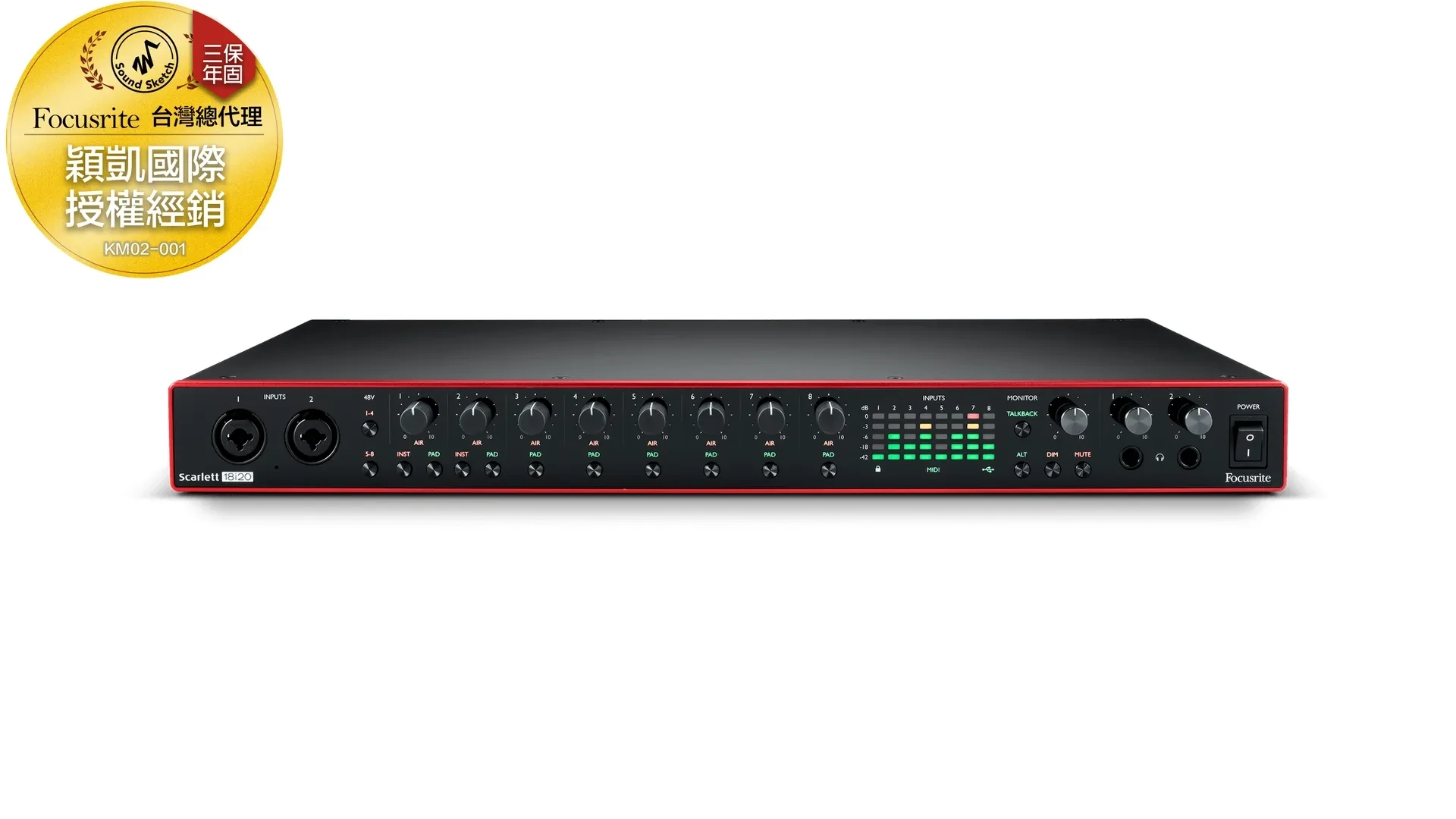 第三代的 Focusrite Scarlett 18i20 提供了大量的功能,而且價格實惠。前面板有兩個亮麗的 Focusrite 麥克風/樂器前級,後面板則有大量的額外 I/O,可同時達到 18 進 / 20 出!在背面,您會發現還有六個額外的 XLR 組合輸入,加上八個通道的 ADAT I/O,S/PDIF 和 MIDI I/O,以及 Word Clock Out。Focusrite 確保 Scarlett 18i20 具備您所需的功能。它配備了一個內置對講系統,可與錄音對象進行通訊,8 個通道的 LED 條形圖顯示器,獨立控制的雙耳機輸出,以及支援雙監視器設置的揚聲器切換,是專業工作室可靠的基礎,而且未來還可擴充。只要插入,啟動綁定的軟體,您就可以開始製作音樂了。
