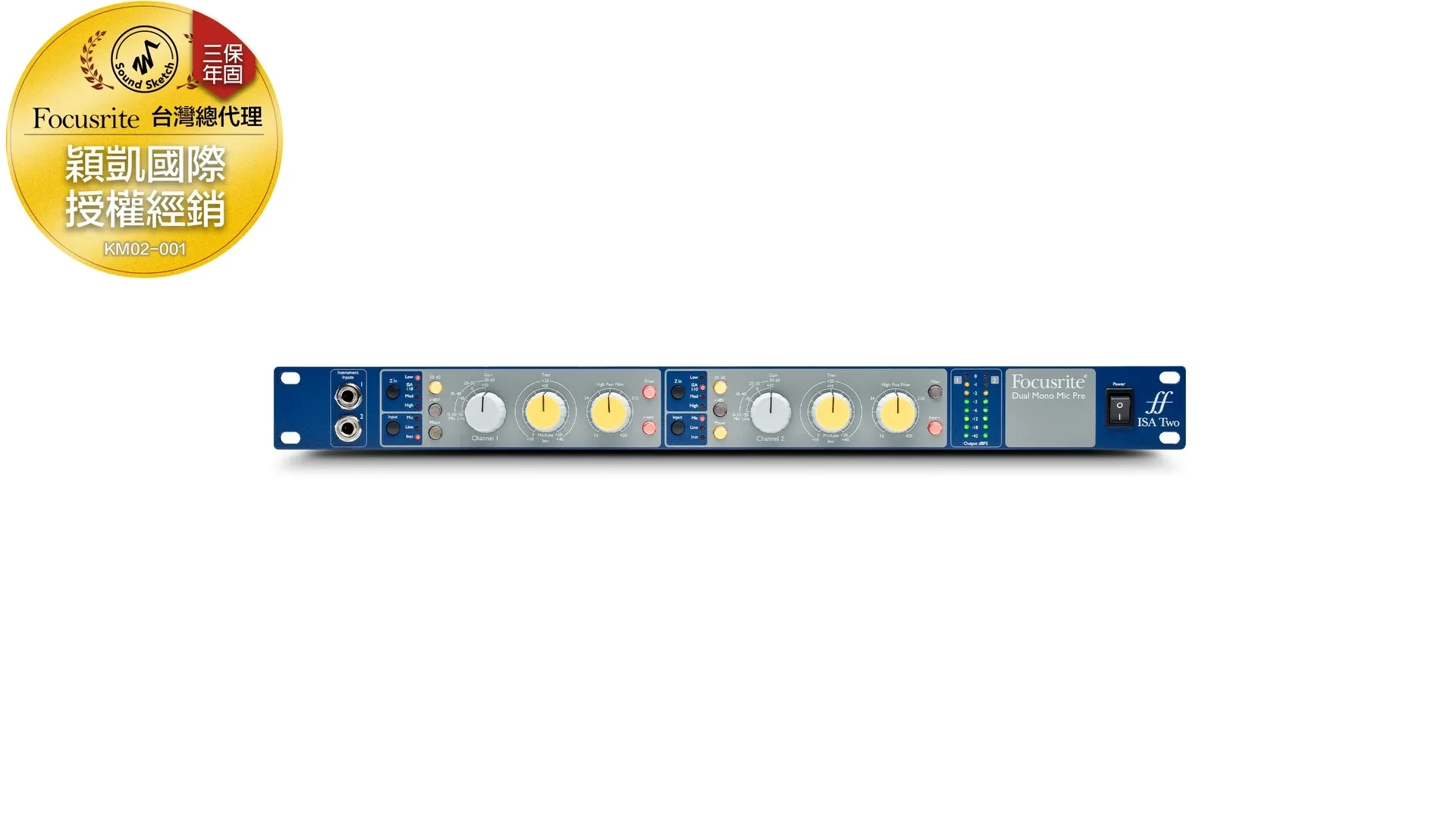每個麥克風前級都可以選擇麥克風、Line或樂器輸入,並具有可變輸入阻抗,以確保您從音源獲得最佳性能。第一個四段旋鈕和增益開關可提供高達60dB的增益,另外還有+20dB的連續可變微調,這意味著在需要時總共可提供80dB的增益,配上一對8段LED儀表以dBFS為單位顯示訊號峰值(背面的小旋鈕可以做校準以適合您的A-D轉換器)。而高通濾波器具有16至420Hz的可變頻率。