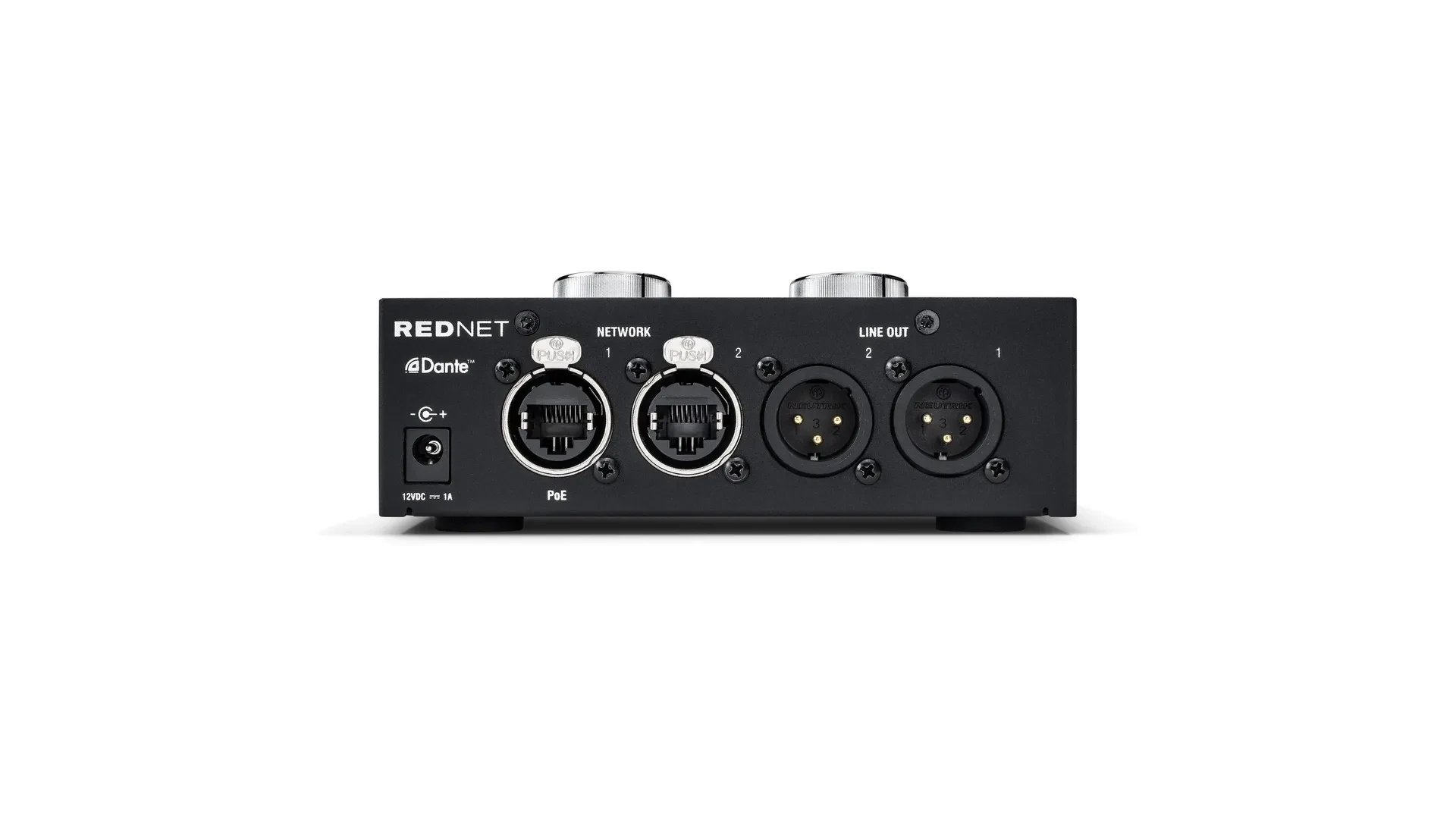 背面的XLR輸出可提供高達24dBu的Line音量,並配有音量控制鈕和靜音開關。前置的耳機輸出能夠驅動大音量訊號,非常適合在高SPL環境中進行監聽。堅固的鋁合金底盤具有螺紋供安裝麥克風架,方便RedNet AM2放置在任何位置,無論是在桌子上還是表演用立架上。最棒的是,IEEE協定的PoE輸入讓一條乙太網路線就能包辦供電、遙控、時序和傳輸等功能。