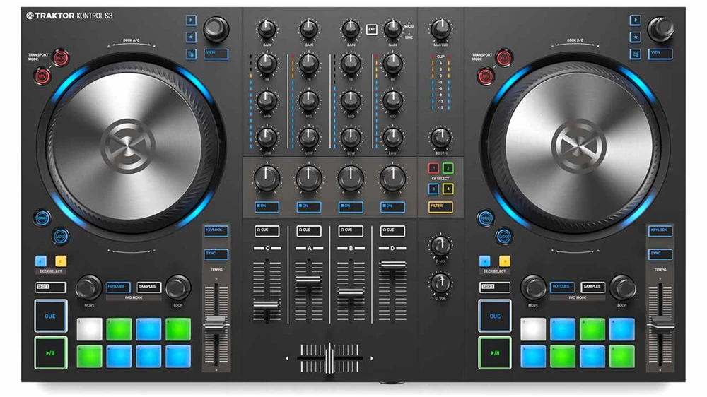 TRAKTOR KONTROL S3 是一款四通道的 DJ 控制器,每一軌都有著全長的音量推子、標準 EQ 旋鈕、Cue 預聽和通道條效果器 Mixer FX。碟盤下方的全彩 RGB 打擊墊讓您可以方便的切換 Hotcue、觸發採樣和循環。當您準備好為 DJ Set 加入一些額外的元素時,切換碟盤,轉盤周圍的燈光會給您提示。