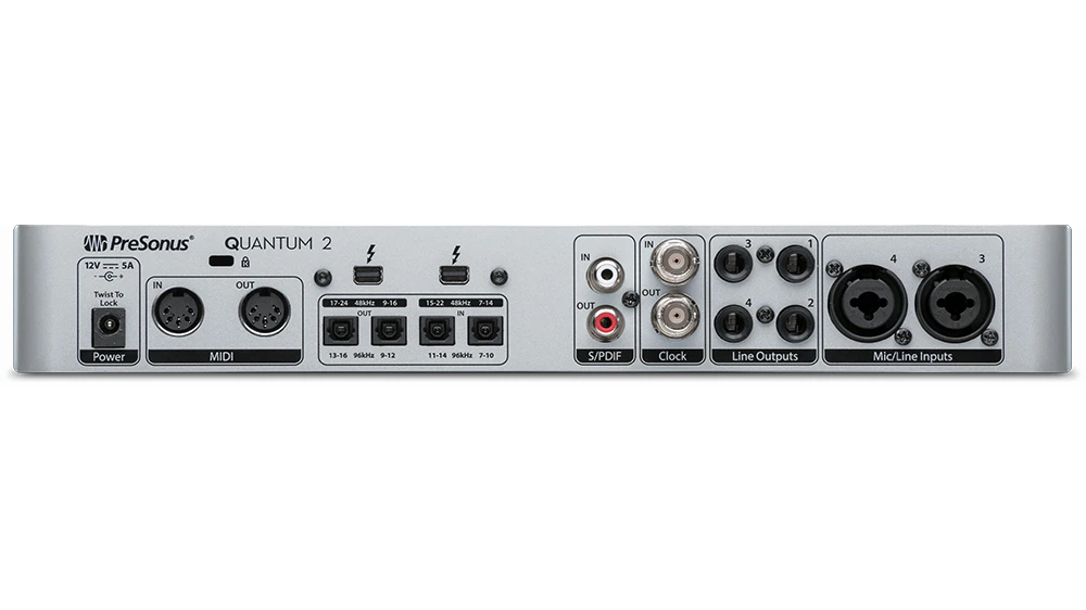 Quantum 2 錄音介面提供 2 組麥克風/樂器輸入端和 2 組麥克風/導線輸入端,每一組都帶有數位控制的 XMAX 前置放大器和單獨的 +48V 幻象電源。你還可以得到 4 組平衡式1/4英吋TRS 輸出端和一組可單獨控制音量的耳機輸出端,不僅如此,還有 ADAT 數位光纖 I/O 和 S/PDIF 立體聲數位 I/O,你可以得到 18 組數位輸入和輸出端。若你還需要更多的 I/O 通道,你可以透過 Thunderbolt 2 連接埠將 4 台 Quantum 2 連接起來,這樣你就可以建立一套總輸入和輸出端多達 80 組的龐大系統。另外還有 BNC 時脈 I/O,可確保你的 Quantum 2 和其他數位音頻設備可以緊密的同步工作。當然你還可以得到 MIDI I/O。
