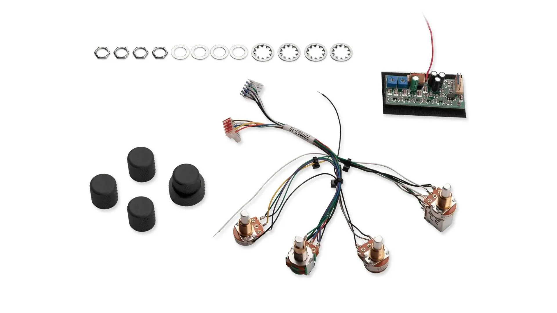 此系統可安裝在任何具有4座控制旋鈕和單顆9V電池空間的六弦貝斯。也可以串連兩顆9V電池以增加動態範圍。此組合包含所有必要的硬體:高品質可變電阻、電池夾,以及黑色旋鈕。電池續航力大約為1000小時。