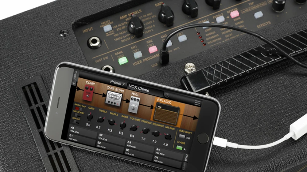 VTX 配置一個 USB 插孔,可連接 PC、Mac,甚至手機的 iOS 和 Android 系統,並與新的 VOX Tone Room 軟體配合,可以編輯您喜愛的音色,效果和預設!